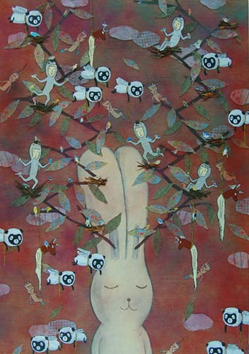 We are falling while birds are singing (2010) Acrylic, collaged fabric, silver foil and decoupage on plywood 33.07 x 23.39 x 1.06 inches 84 x 59.4 x 2.7 cm